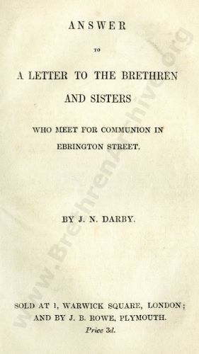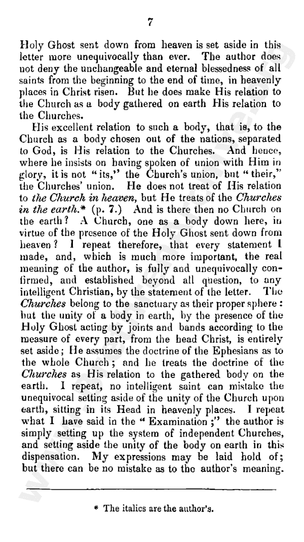 His excellent relation to such a body (that is, to the church as a body chosen out of the nations, separated to God) is His relation to the churches. And hence, where he insists on having spoken of union with Him in glory, it is not "its," the church's union, but "their," the churches' union. He does not treat of His relation to the church in heaven, but He treats of the churches in the earth.* (page 7). And is there then no church on the earth? - a church, one as a body down here, in virtue of the presence of the Holy Ghost sent down from heaven? I repeat, therefore, that every statement I made, and, which is much more important, the real meaning of the author, is fully and unequivocally confirmed and established beyond all question, to any intelligent Christian, by the statement of the letter. The churches belonging to the sanctuary as their proper sphere: but the unity of a body in earth, by the presence of the Holy Ghost acting by joints and bands according to the measure of every part, from the Head Christ, is entirely set aside. He assumes the doctrine of the Ephesians as to the whole church; and he treats the doctrine of the churches as His relation to the gathered body on the earth. I repeat, No intelligent saint can mistake the unequivocal setting aside of the unity of the church upon earth, sitting in its Head in heavenly places. I repeat - what I have said in the "Examination" - the author is simply setting up the system of independent churches, and setting aside the unity of the body on earth in this dispensation. My expressions may be laid hold of; but there can be no mistake as to the author's meaning.