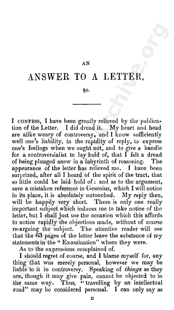 I confess I have been greatly relieved by the publication of the letter. I did dread it. My heart and head are alike weary of controversy, and I know sufficiently well one's liability, in the rapidity of reply, to express one's feelings when we ought not, and to give a handle for a controversialist to lay hold of, that I felt a dread of being plunged anew into a labyrinth of reasoning. The appearance of the letter has relieved me. I have been surprised, after all I heard of the spirit of the tract, that so little could be laid hold of: and as to the argument (save a mistaken reference to Gesenius, which I will notice in its place) it is absolutely untouched. My reply, then, will be happily very short. There is only one really important subject which induces me to take notice of the letter, but I shall just use the occasion which this affords to notice rapidly the objections made, without of course re-arguing the subject. The attentive reader will see that the sixty-three pages of the letter leave the substance of my statements in the "Examination" where they were.