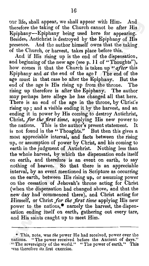 And if His rising up is the end of the dispensation, and beginning of the new age (see page 11 of "Thoughts"), how comes it that the church is taken up "after this epiphany and at the end of the age"? The end of the age must in that case be after the epiphany. But the end of the age is His rising up from the throne. The rising up therefore is after the epiphany. The author may perhaps here allege he has changed all that here. There is an end of the age in the throne by Christ's rising up; and a visible ending it by the harvest; and an ending it in power by His coming to destroy Antichrist (Christ, for the first time, applying His new power to the nations). This is the author's present statement. It is not found in the "Thoughts." But then this gives a most appreciable interval, and facts between the rising up, or assumption of power by Christ, and His coming to earth in the judgment of Antichrist - nothing less than the whole harvest, by which the dispensation ends itself on earth, and therefore is an event on earth, to say nothing of heaven. So that there is an appreciable interval, by an event mentioned in Scripture as occurring on the earth between His rising up, or assuming power on the cessation of Jehovah's throne acting for Christ (when the dispensation had changed above, and that the new day had commenced there), and Christ acting for Himself, or Christ for the first time applying His new power to the nations,* namely the harvest, the dispensation ending itself on earth, gathering out every tare, and His saints caught up to meet Him.