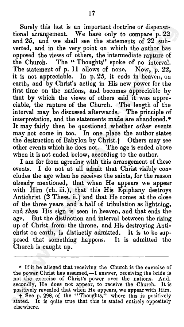 Surely this last is an important doctrine or dispensational arrangement. We have only to compare pages 22 and 25, and we shall see the statements of page 22 subverted, and in the very point on which the author has opposed the views of others, the intermediate rapture of the church. The "Thoughts" spoke of no interval. The statement of page 11 allows of none. Now in page 22 it is not appreciable. In page 25 it ends in heaven, on earth, and by Christ's acting in His new power for the first time on the nations, and becomes appreciable by that which the views of others said it was appreciable - the rapture of the church. The length of the interval may be discussed afterwards. The principle of interpretation and the statements made are abandoned.* It may fairly then be questioned whether other events may not come in too. In one place the author states the destruction of Babylon by Christ.** Others may see other events which he does not. The age is ended above when it is not ended below, according to the author.