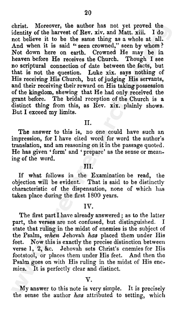 As to the quotation from page 11 of my tract in page 20, the language is not drawn from Psalm 8, and the sentiment does not belong to verse 2 of Psalm 110. And it is so far from being true that I have not distinguished between verses 1 and 2, that I have argued at length (page 30 - the passage the author has just been commenting on), that there must be a considerable interval, such that all that regards the church will have happened between the two; so that the heavenly part of Christ's actings is omitted in the psalm. And this last is in italics, to shew the importance of the events which happen in the interval. And I still judge that "the authority of His power giving them up to be trampled upon by Christ" is not verse 2, but verse I. For this simple reason, that verse 2 speaks of sending the rod of Christ's power out of Zion; verse I speaks of His (God's) setting them for Christ's footstool (that is, of His power giving them up to be trampled on). Further, the question is not whether Jehovah has been acting to bring about Christ's glory; no Christian doubts it.
