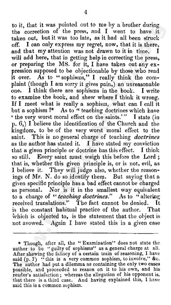 As to the expressions complained of, I should regret, of course, and I blame myself for, anything that was merely personal, however we may be liable to it in controversy. Speaking of things as they are, though it may give pain, cannot be objected to in the same way. Thus, "travelling by an intellectual road" may be considered personal. I can only say as to it, that it was pointed out to me by a brother during the correction for the press, and I went to have it taken out, but it was too late, as it had all been struck off. I can only express my regret now, that it is there, and that my attention was not drawn to it in time. I will add here, that in getting help in correcting the press, or preparing the MS for it, I have taken out any expression supposed to be objectionable by those who read it over. As to "sophisms," I really think the complaint (though I am sorry it gives pain) an unreasonable one. I think there are sophisms in the book. I write to examine the book, and shew where I think it wrong. If I meet what is really a sophism, what can I call it but a sophism?*