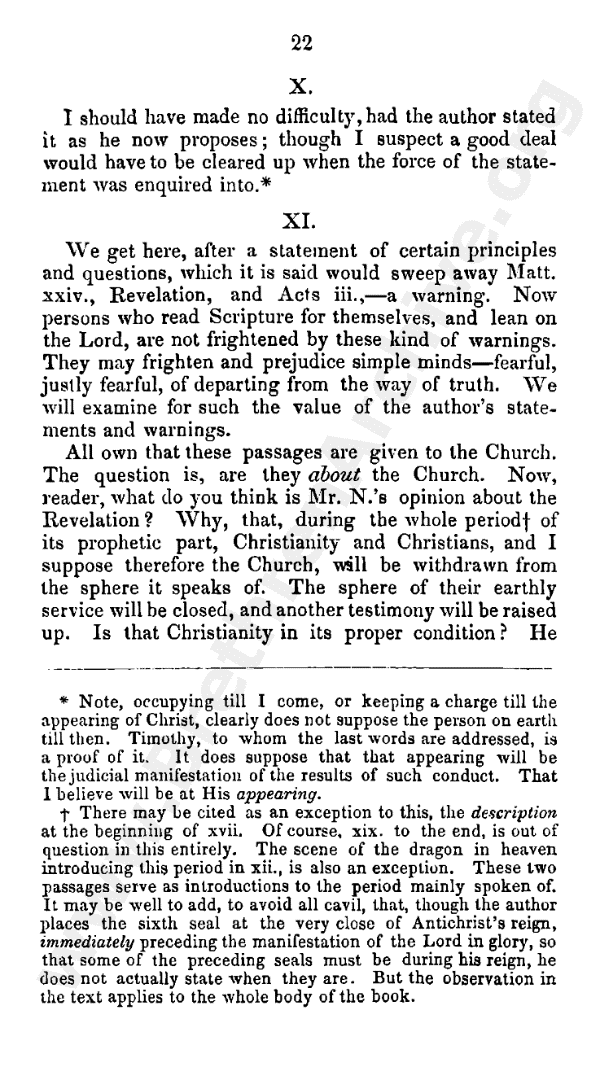 All own that these passages are given to the church. The question is, Are they about the church? Now, reader, what do you think is Mr. N.'s opinion about the Revelation? Why, that, during the whole period* of its prophetic part, Christianity and Christians, and I suppose therefore the church, will be withdrawn from the sphere it speaks of. The sphere of their earthly service will be closed, and another testimony will be raised up. Is that Christianity in its proper condition? He may not think the saints are caught up. But he does not himself think that the prophetic period of the Revelation applies to Christianity in its proper condition. Does it belong in any real sense to the church dispensation when Christianity will be gone out of the sphere it speaks of?