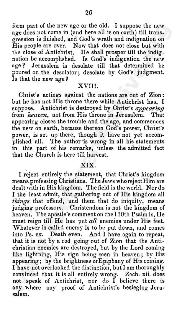 18. Christ's actings against the nations are out of Zion: but He has not His throne there while Antichrist has, I suppose. Antichrist is destroyed by Christ's appearing from heaven, not from His throne in Jerusalem. That appearing closes the trouble and the age, and commences the new on earth, because thereon God's power, Christ's power, is set up there, though it have not yet accomplished all. The author is wrong in all his statements in this part of his remarks, unless the admitted fact that the church is here till harvest.