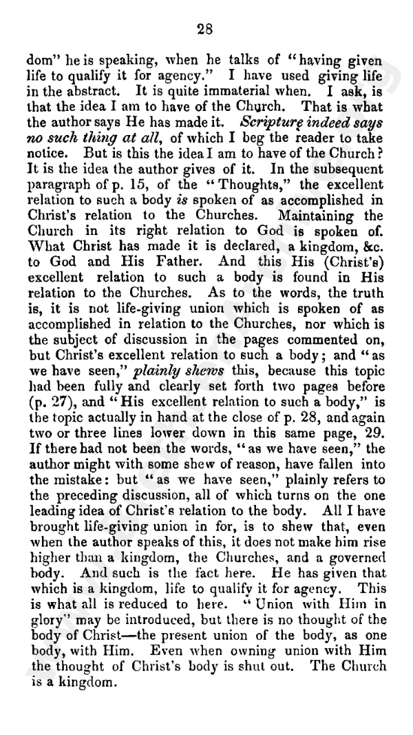 I had nearly forgotten, in consequence of its being in a note, what is contained in that at the foot of page 9. I have only to repeat, on reviewing the author's statements, my conviction of the substantial justice and importance of what I have said. My conviction of the import and bearing of pages 14, 15 of the "Thoughts" is not weakened at all after reading his letter, and re-reading them. "Giving," or "having given," does not in the smallest degree affect the question to my mind. What the author makes of the church, as a body chosen out of the nations and separated to God, is a kingdom. He has misstated the force of the passage; but for this I refer to the "Examination." It is of "this kingdom" he is speaking, when he talks of "having given life to qualify it for agency." I have used giving life in the abstract. It is quite immaterial when I ask, Is that the idea I am to have of the church? That is what the author says he has made it. Scripture indeed says no such thing at all, of which I beg the reader to take notice. But is this the idea I am to have of the church? It is the idea the author gives of it. In the subsequent paragraph of page 15, of the "Thoughts," the excellent relation to such a body is spoken of as accomplished in Christ's relation to the churches. Maintaining the church in its right relation to God is spoken of. What Christ has made it is declared a kingdom, etc., to God and His Father. And this His (Christ's) excellent relation to such a body is found in His relation to the churches. As to the words, the truth is, it is not life-giving union which is spoken of as accomplished in relation to the churches, nor which is the subject of discussion in the pages commented, on but Christ's excellent relation to such a body; and "as we have seen" plainly shews this, because this topic had been fully and clearly set forth two pages before (page 34), and "His excellent relation to such a body" is the topic actually in hand at the close of page 35, and again two or three lines lower down in this same page (36). If there had not been the words "as we have seen," the author might with some show of reason have fallen into the mistake: but "as we have seen" plainly refers to the preceding discussion, all of which turns on the one leading idea of Christ's relation to the body. All I have brought life-giving union in for, is to shew that, even when the author speaks of this, it does not make him rise higher than a kingdom, the churches, and a governed body. And such is the fact here. He has given that which is a kingdom, life to qualify it for agency. This is what all is reduced to here. "Union with Him in glory" may be introduced; but there is no thought of the body of Christ - the present union of the body, as one body, with Him. Even when owning union with Him the thought of Christ's body is shut out. The church is a kingdom.