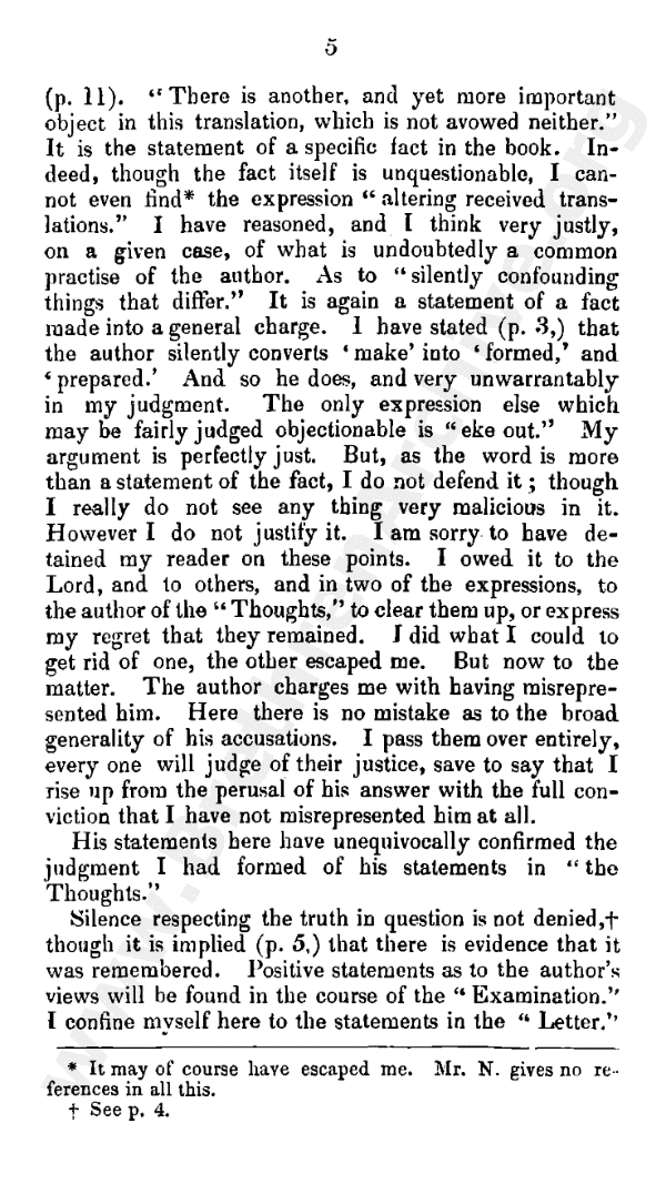 As to "altering received translations," the fact cannot be denied. It is the constant habitual practice of the author. That which is objected to is the statement that the object is not avowed. Again I have stated this in a given case (page 13). "There is another, and yet more important object in this translation, which is not avowed either." It is the statement of a specific fact in the book. Indeed, though the fact itself is unquestionable, I cannot even find* the expression "altering received translations." I have reasoned, and I think very justly, on a given case of what is undoubtedly a common practice of the author. As to "silently confounding things that differ," it is again a statement of a fact made into a general charge. I have stated (page 10) that the author silently converts "make" into "formed" and "prepared." And so he does, and very unwarrantably in my judgment. The only expression else which may be fairly judged objectionable is "eke out." My argument is perfectly just. But, as the word is more than a statement of the fact, I do not defend it; though I really do not see anything very malicious in it. However I do not justify it.