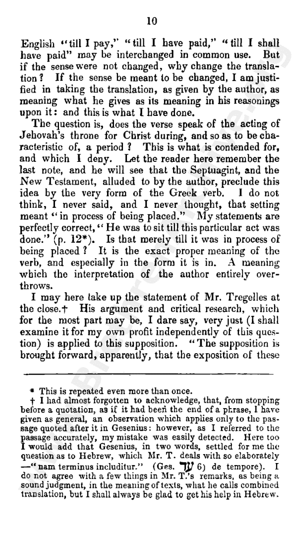 I may here take up the statement of Mr. Tregelles at the close.* His argument and critical research, which for the most part may be, I dare say, very just (I shall examine it for my own profit independently of this question) is applied to this supposition. "The supposition is brought forward, apparently, that the exposition of these words may be, or must be, "until I shall be setting," or "am setting," and not until "I have set," or "shall have set."["] Against this meaning he directs all his reasonings and criticisms. But then this supposition is all wrong. I had stated the contrary. "He is expecting till something be done." "He was to sit till this particular act was done." Hence all the reasonings of Mr. Tregelles come to nothing as to the argument.