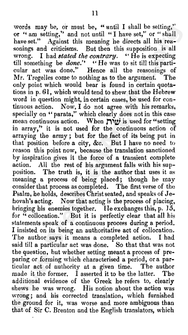 The only point that would bear is found in certain quotations in page 61, which would tend to shew that the Hebrew word in question might, in certain cases, be used for continuous action. Now, I do not agree with his remarks, specially on "parata," which clearly does not in this case mean continuous action. When the Hebrew word in Psalm 110: 1 is used for "setting in array," it is not used for the continuous action of arraying the army; but for the fact of its being put in that position before a city, etc. But I have no need to reason this point now, because the translation sanctioned by inspiration gives it the force of a transient complete action. All the rest of his argument falls with his supposition.