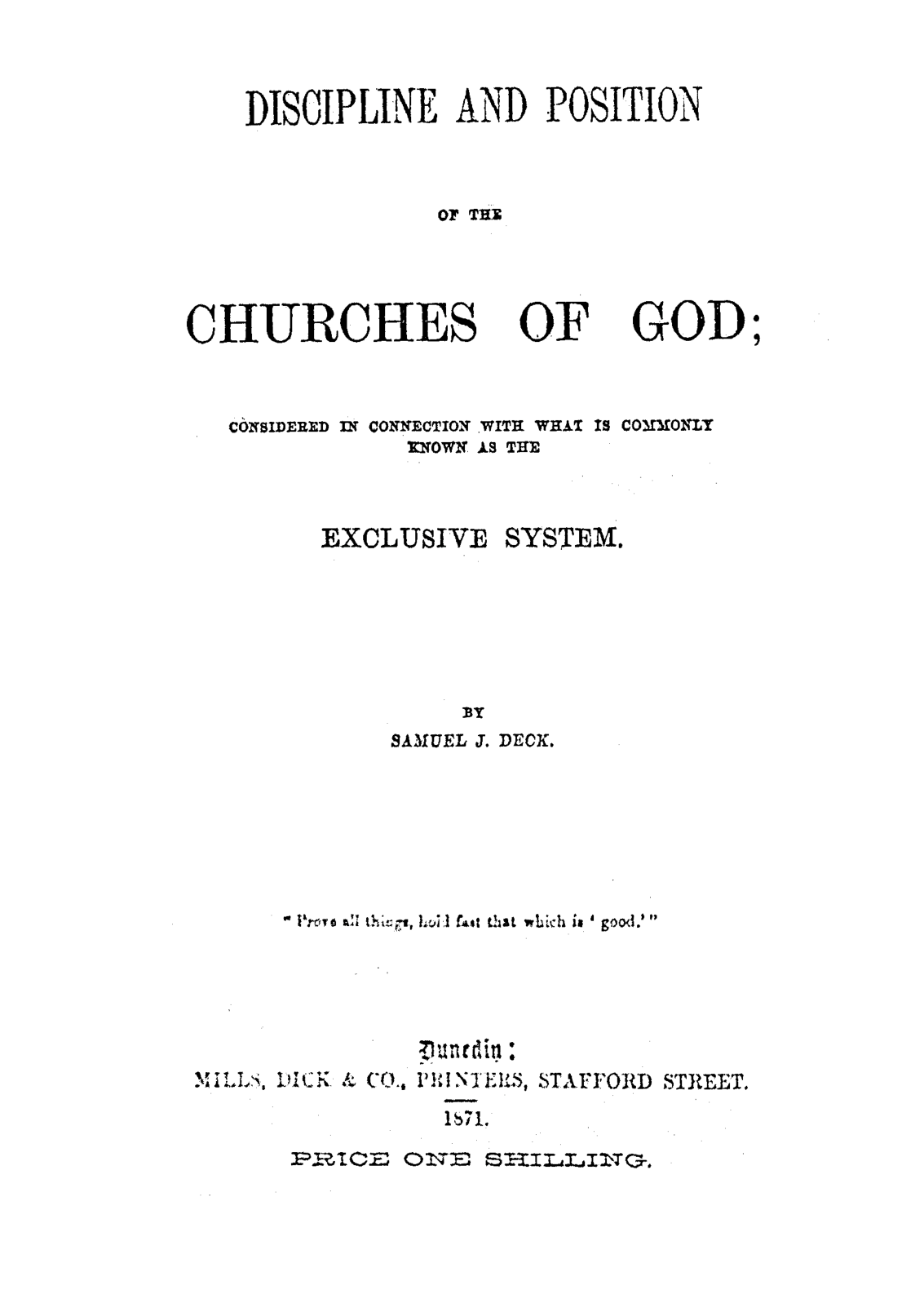 My Dear Samuel Deck, - I am glad for your own sake that your tract is withdrawn; you will perhaps, ere I write this, have received a letter from me. Its effect I had no fear of, for the simple reason that it wholly gave up all the principles brethren meet on, and would be judged by every intelligent brother.