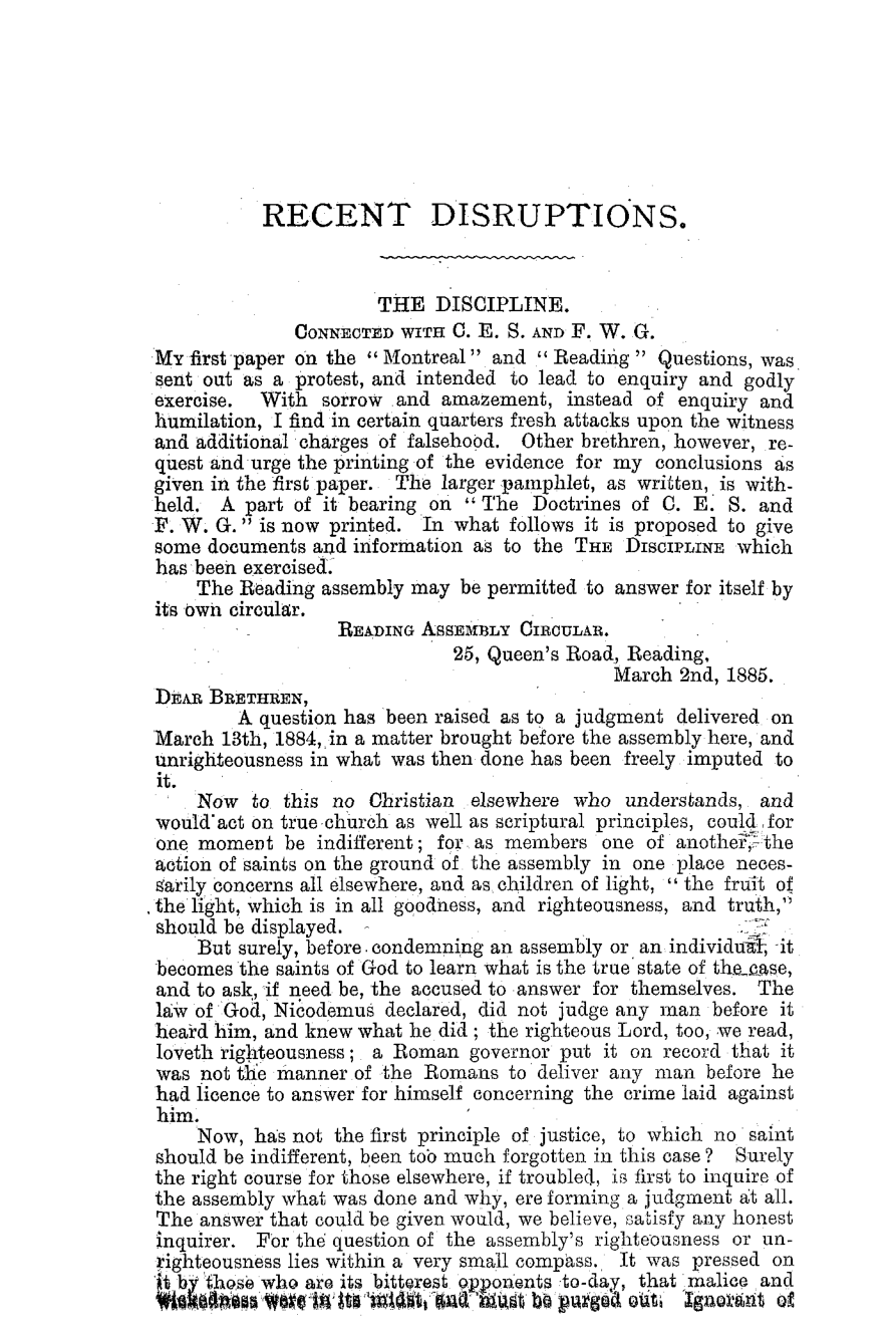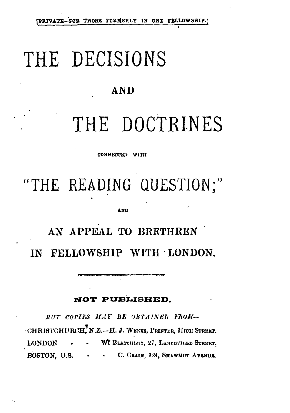 Correspondence in Relation to The Judgement of the Reading Assembly of March 13th 1884