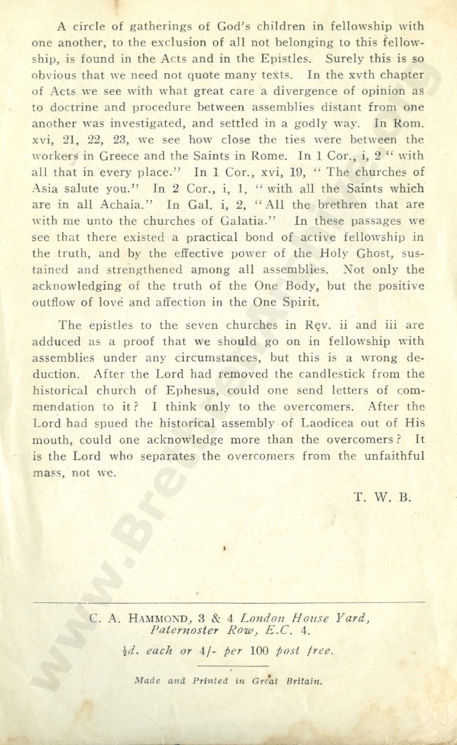 TWB is Travers William Bayly (1853-1935). His tract was also reprinted in N. Noels's book on the "Brethren" in vol. II, pages 771-773. Bayly was often in Germany were he worked very much.