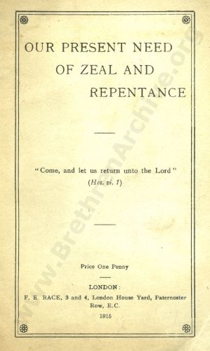Obviously T. D. was from a “Kelly” background (F. E. Race as publisher points to this). Thus it is quite probably that T. D. is Theo Davis from Blackheath. He had a part in the correspondence between the “Kelly” and the “Lowe” Brethren in the 1920th. Noel’s history (vol.II, pages 745 – 750) has only his initials “T. D.” but a German Letter of R. Brockhaus from July 1926 gives his full name. Theo Davis was a regular contributor to “Bible Monthly” (as “T. D.”, but once with full name: vol. 3 [1923], p. 46), often with verses. I have the copy of a photograph which shows Davis together with H. Wreford and W. J. Hocking. Thy Precepts, vol. 18, #3 [May/June 2003], page 84, mentions a text by Davis in a booklet (?) with the title: “On the Human Personality of Christ” – probably against F. E. Ravens heresies. Do you have access to this text? Christian greetings Martin