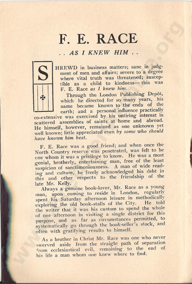 I am researching some of the deceased buried in Brockley & Ladywell cemeteries ( SE London) One of those recorded as buried here is a Frederick Elijah Race ( d.1921) Would it be possible to have access to the document' Character Sketch' of FER by W G Turner on your website to assist in this research ?