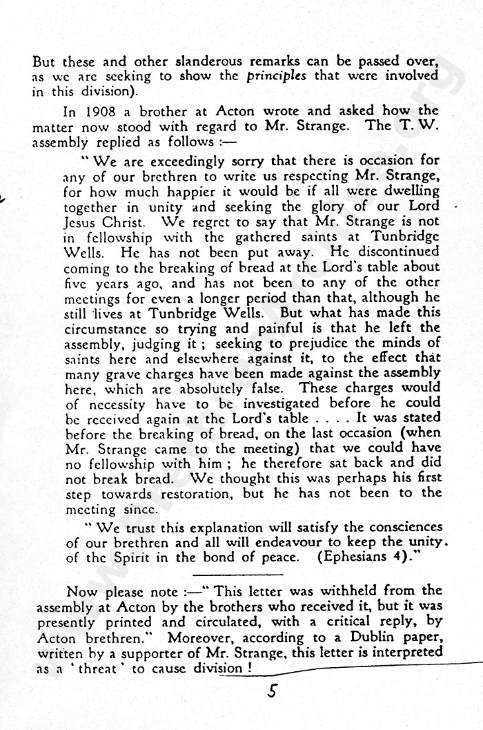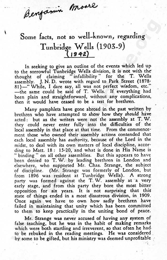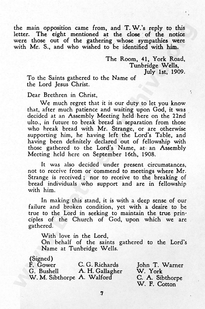 Anyone doing their research properly will seek out primary sources rather than rely on later secondary sources which usually contain opinions and not just the facts. As can be seen several times in this letter, the judgement arrived at with regard to Mr Strange was made at 41 York Road, Tunbrdge Wells, yet interestingly, the gathering would no longer be recognised as a "Tunbridge Wells" meeting.