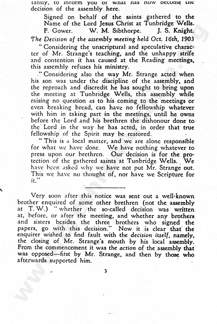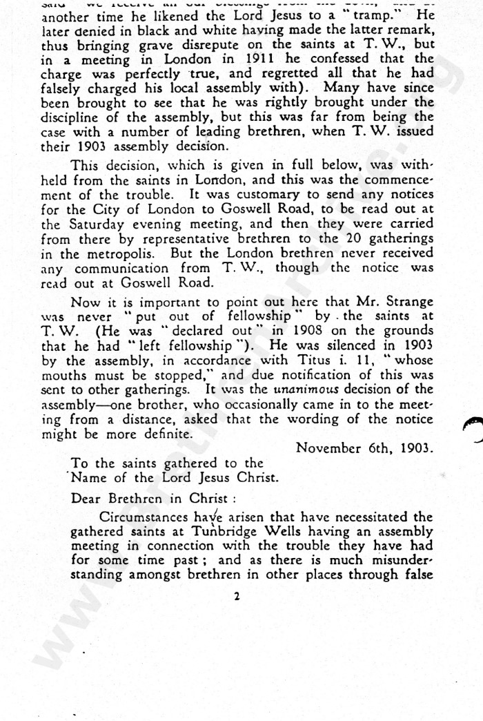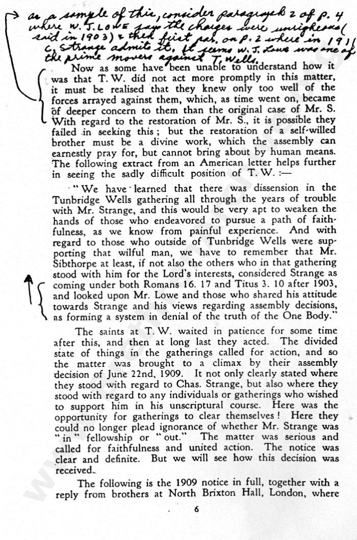 Anyone doing their research properly will seek out primary sources rather than rely on later secondary sources which usually contain opinions and not just the facts. As can be seen several times in this letter, the judgement arrived at with regard to Mr Strange was made at 41 York Road, Tunbrdge Wells, yet interestingly, the gathering would no longer be recognised as a "Tunbridge Wells" meeting.