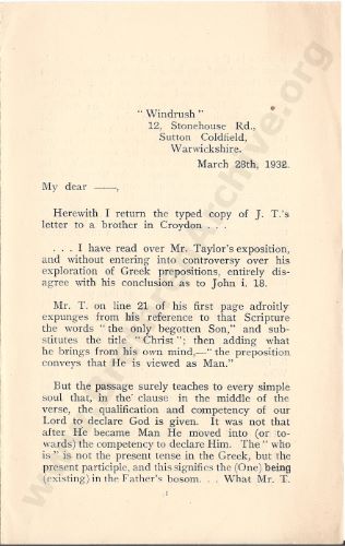 Letter Commenting on Mr Taylor's Interpretation of John 1.18
