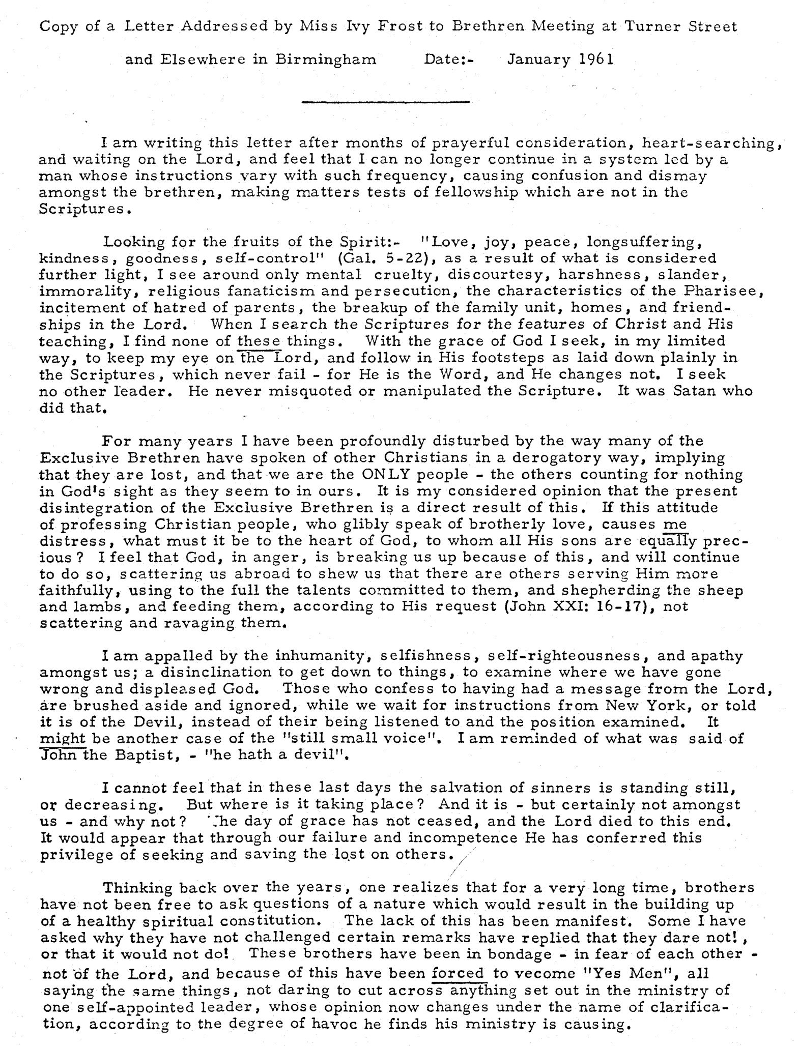 Copy of a Letter Addressed by Miss Ivy Frost to Brethren Meeting at Turner Street and Elsewhere in Birmingham