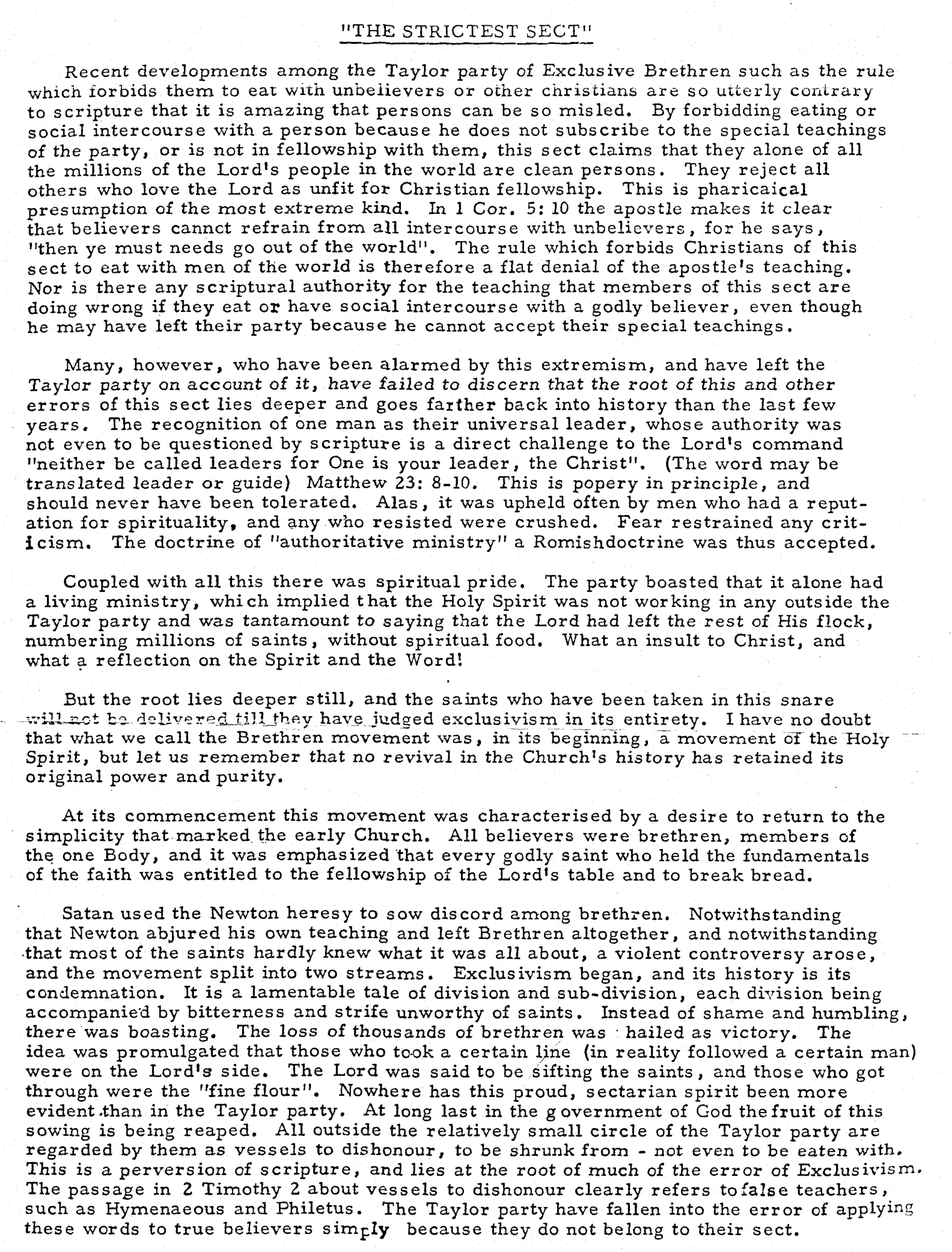 "But the root lies deeper still, and the saints who have been taken in this snare will not be delivered tlill they have judged exclusivism in its entirety. I have no doubt that what we call the Brethren movement was, in its beginning, a movement of the Holy Spirit, but let us remember .. "