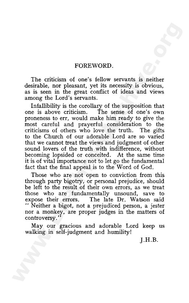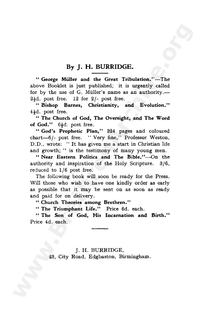 This book is one among several others which J H Burridge wrote in response to the influx of “Needed Truth” teachings then gaining rapid support among the Open Brethren, this being the so-called “tightening process” as sometimes called.