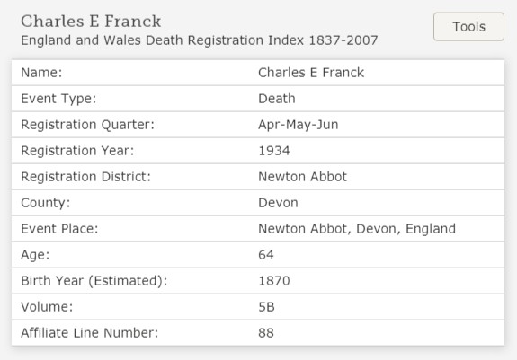 Charles Edward Franck was born in Madras, (c.1869), and died in Babbacombe, Devon (1934) . In c.1917 he married Frances Elizabeth Bewes whose mother was a Soltau and a 'great personal friend of J L Harris' . Many years ago I consulted the copies of the Christian Witness in the library of the Editors of Echoes of service which had belonged to one of the editors Mr W.R. Lewis. In a letter addressed to Lewis, Franck explained that the attributions of the anonymous articles were based on what J.L. Harris had told Franck's mother-in-law. That would tally with Henry Pickering's reference to 'Mr. CHAS. E. FRANCK, of Paignton, his late beloved wife, and their many "early brethren" friends.' Timothy Stunt