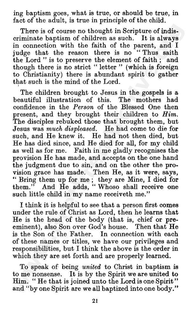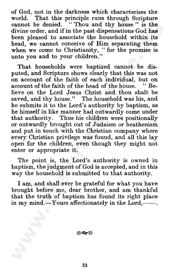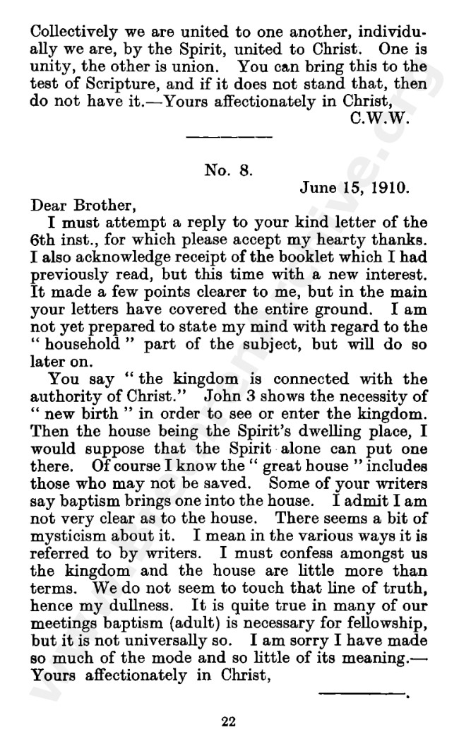 Well known pamphlet justifying 'Infant Baptism' (though they prefer to refer to it as 'Household Baptism'). Framed as a series of letters between an Exclusive, and an Open Brother (J. Collie Smith), with the OB being convinced in the end. See also http://www.christian-baptism.com/wycherley-response.htm