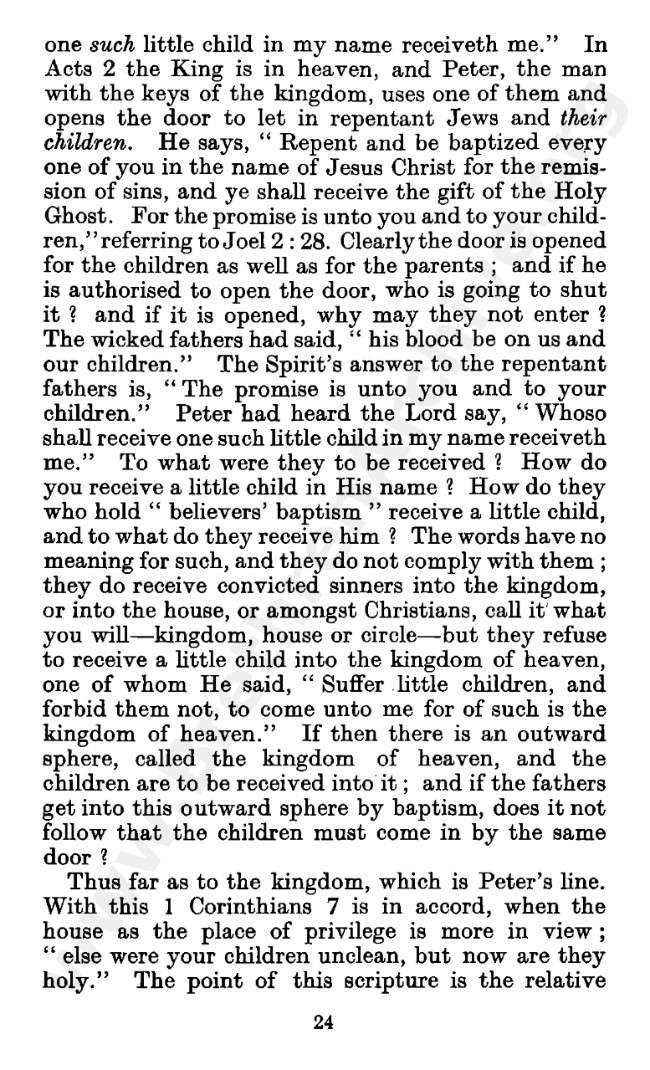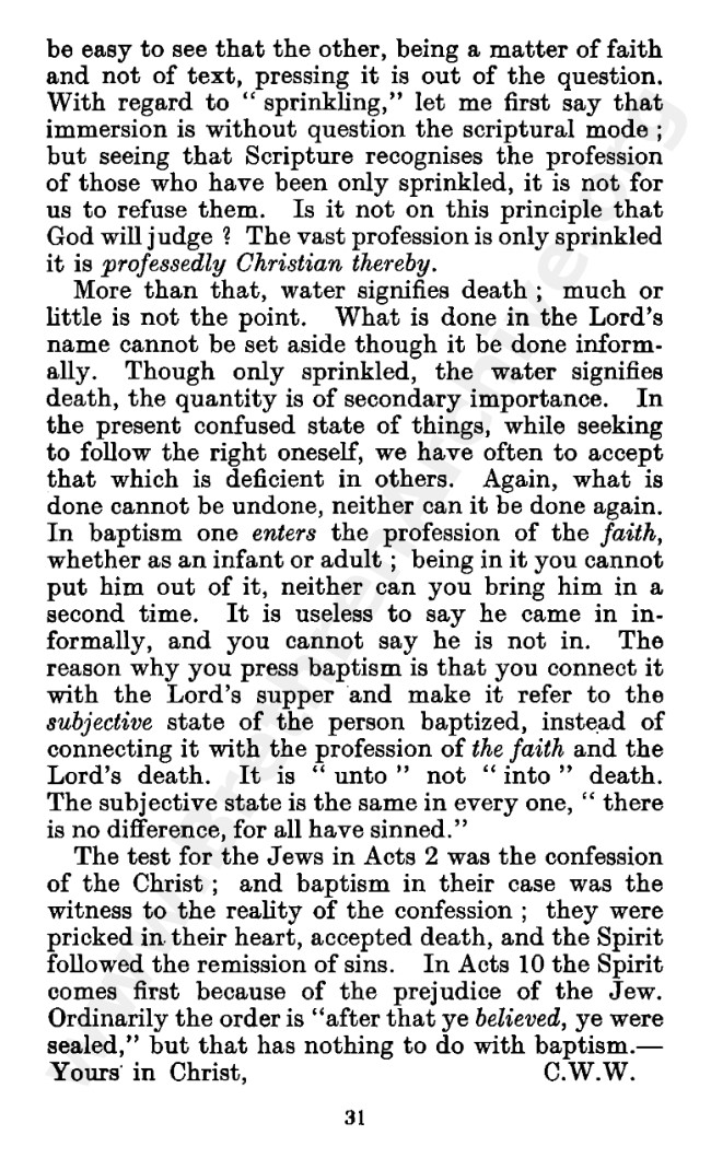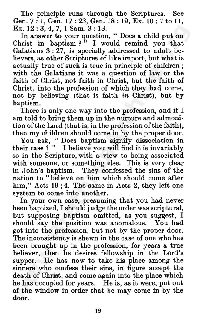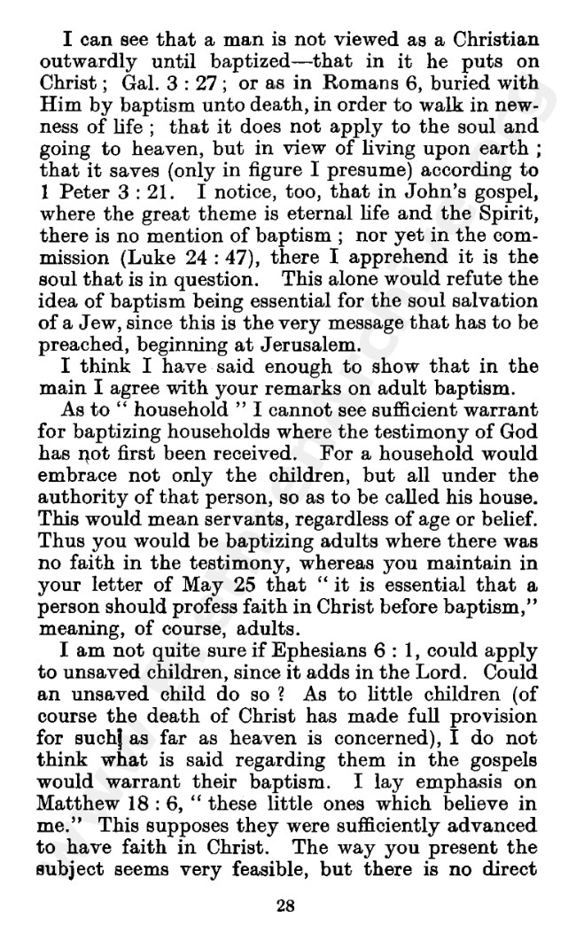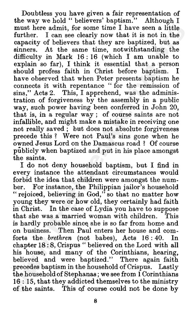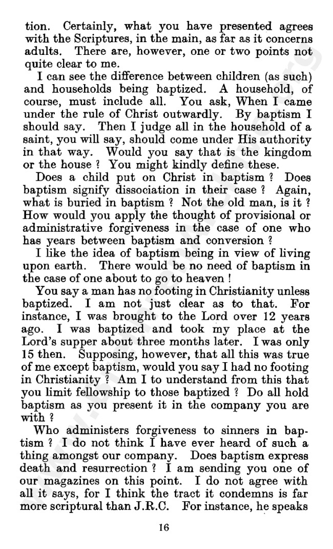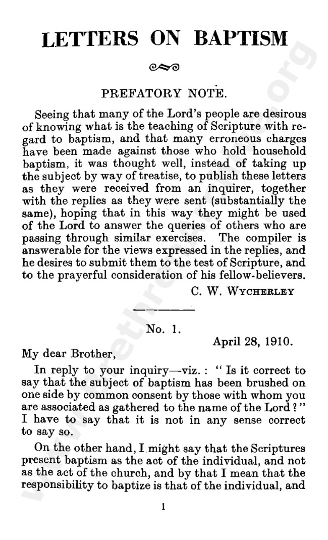 Well known pamphlet justifying 'Infant Baptism' (though they prefer to refer to it as 'Household Baptism'). Framed as a series of letters between an Exclusive, and an Open Brother (J. Collie Smith), with the OB being convinced in the end. See also http://www.christian-baptism.com/wycherley-response.htm