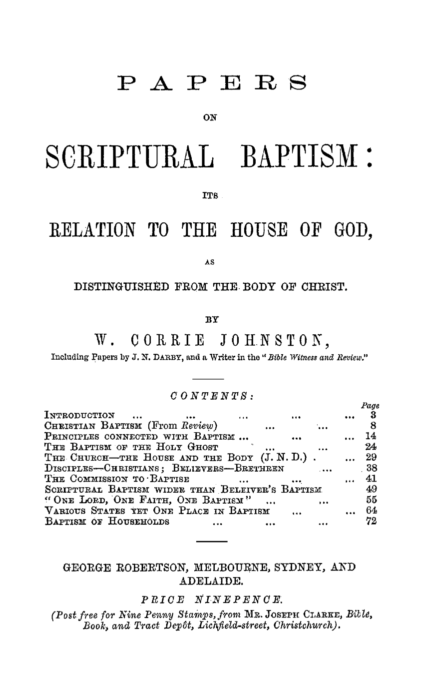 Papers on Scriptural Baptism: Its Relation to the House of God, as Distinguished from the Body of Christ.