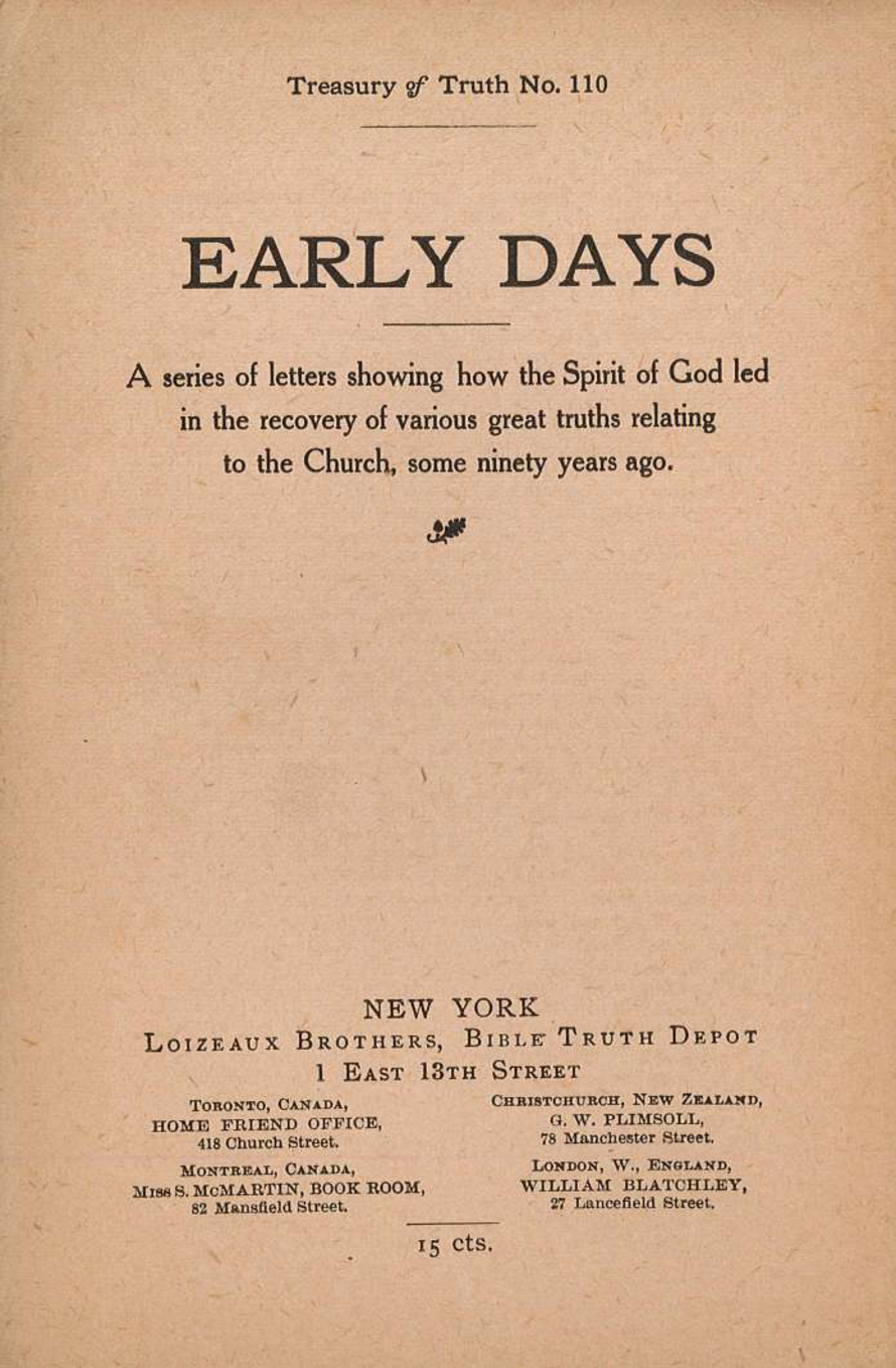 110 - Early Days: A Series of Letters Showing How the Spirit of God Led in the Recovery of Various Great Truths Relating to the Church, Some Ninety Years Ago.