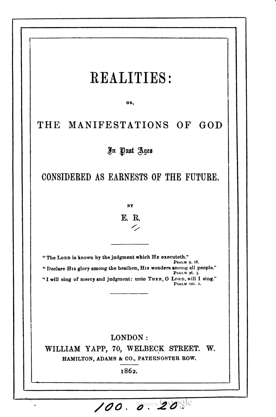 Realities: or, The Manifestations of God in Past Ages Considered as Earnests of the Future