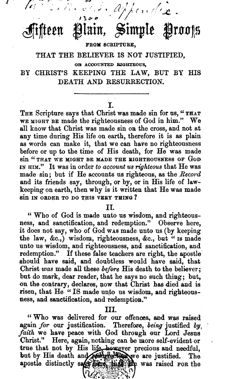 Fifteen Plain, Simple Proofs from Scripture, that the Believer is not Justified, or Accounted Righteous, by Christ's Keeping the Law, but by His death and Resurrection