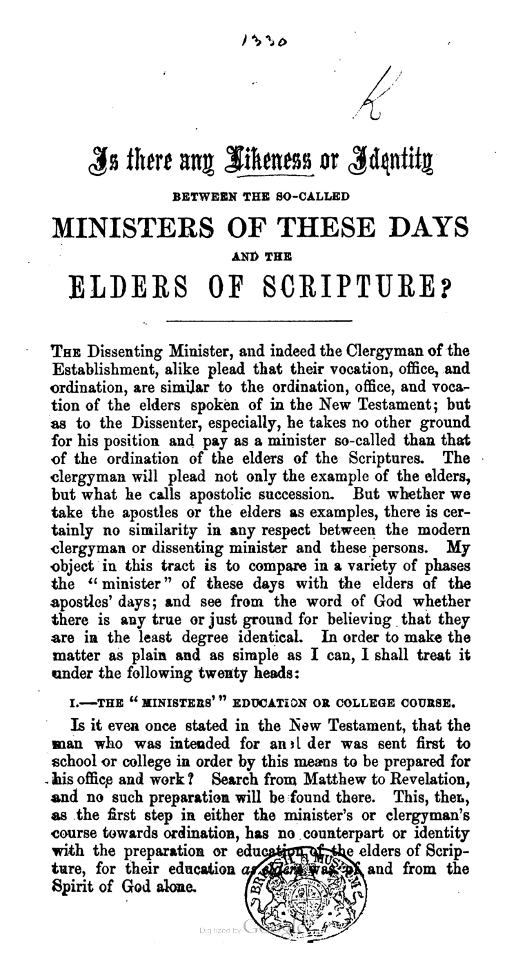 Is there any Likeness or Identity between the so-called Ministers of these days and the Elders of Scripture?