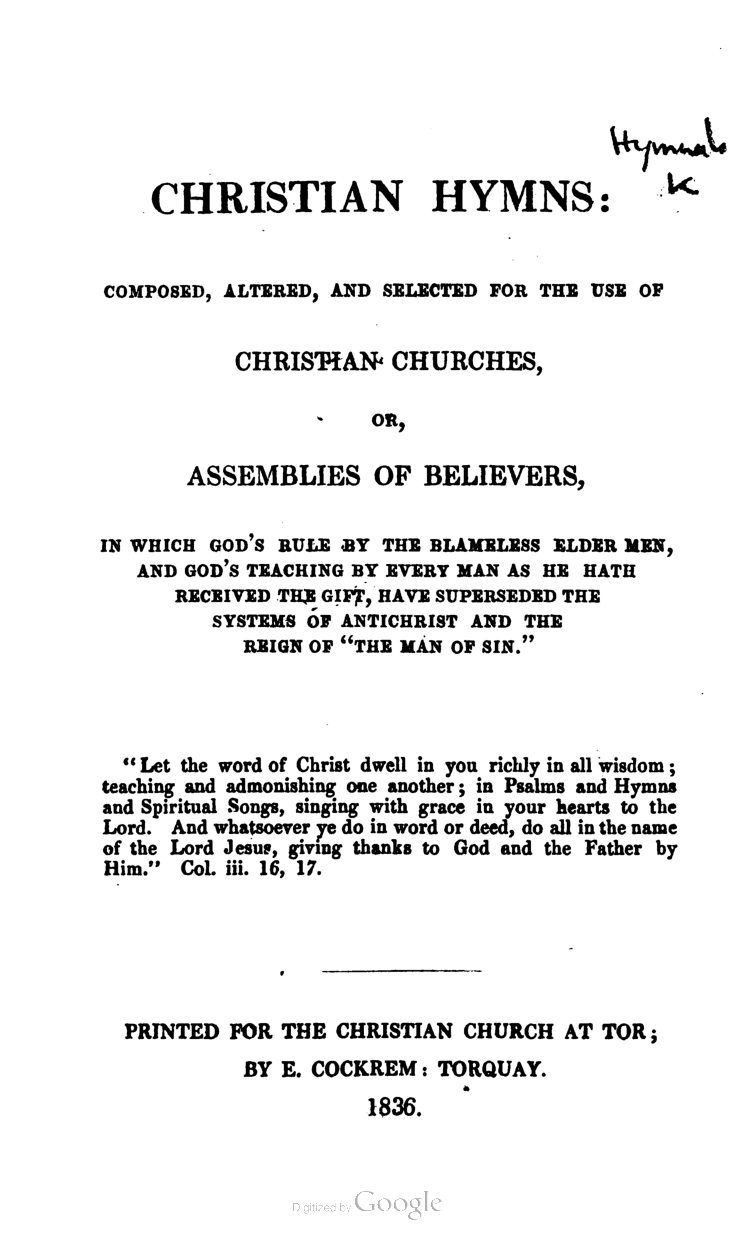 Christian Hymns: composed, altered, and selected for the use of Christian Churches, or assemblies of believers etc