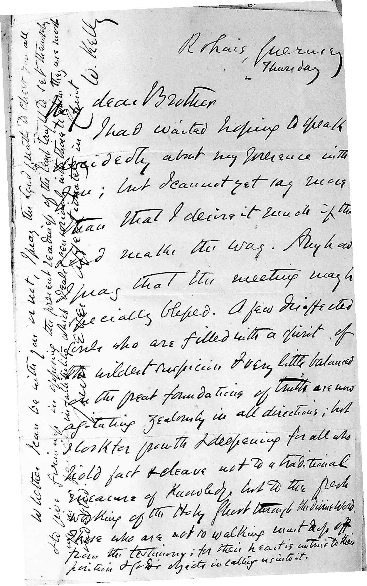 I had waited hoping to speak decidedly about my presence with you; but I cannot yet say more than that I desire it much if the Lord make the way. Anyhow I pray that the meeting may be specially blessed. A few disaffected souls who are filled with a spirit of the wildest suspicion & very little balanced on the great foundations of truth are now agitating zealously in all directions; but I look for growth & deepening for all who hold fast & cleave not to a traditional measure of knowledge but to the fresh working of the Holy Ghost through the divine Word. Those who are not so walking must drop {?} off from the testimony; for their heart is untrue to their position & God’s objects in calling us into it.
