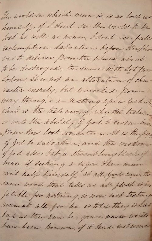 The world in which man is, is as lost as himself, if I don[’]t see the world to be lost as well as man, I don[’]t see full redemption. Salvation before the flood was to deliver from the place about to be destroyed, the same with Lot from Sodom. It is not an alteration of character merely, but converted from every thing, & a resting upon God. Now what is the testimony[?] Why the testimony is unto the ability of God to rescue man from this lost condition. Xt is the power of God to salvation and the wisdom of God also: but a stumbling block if man is seeking a sign. When man can’t help himself at all, God can, the same word that tells us that all flesh is profitable for nothing, is now not testing man at all, for he is told they are as bad as they can be, grace never would have been known, if it had not come