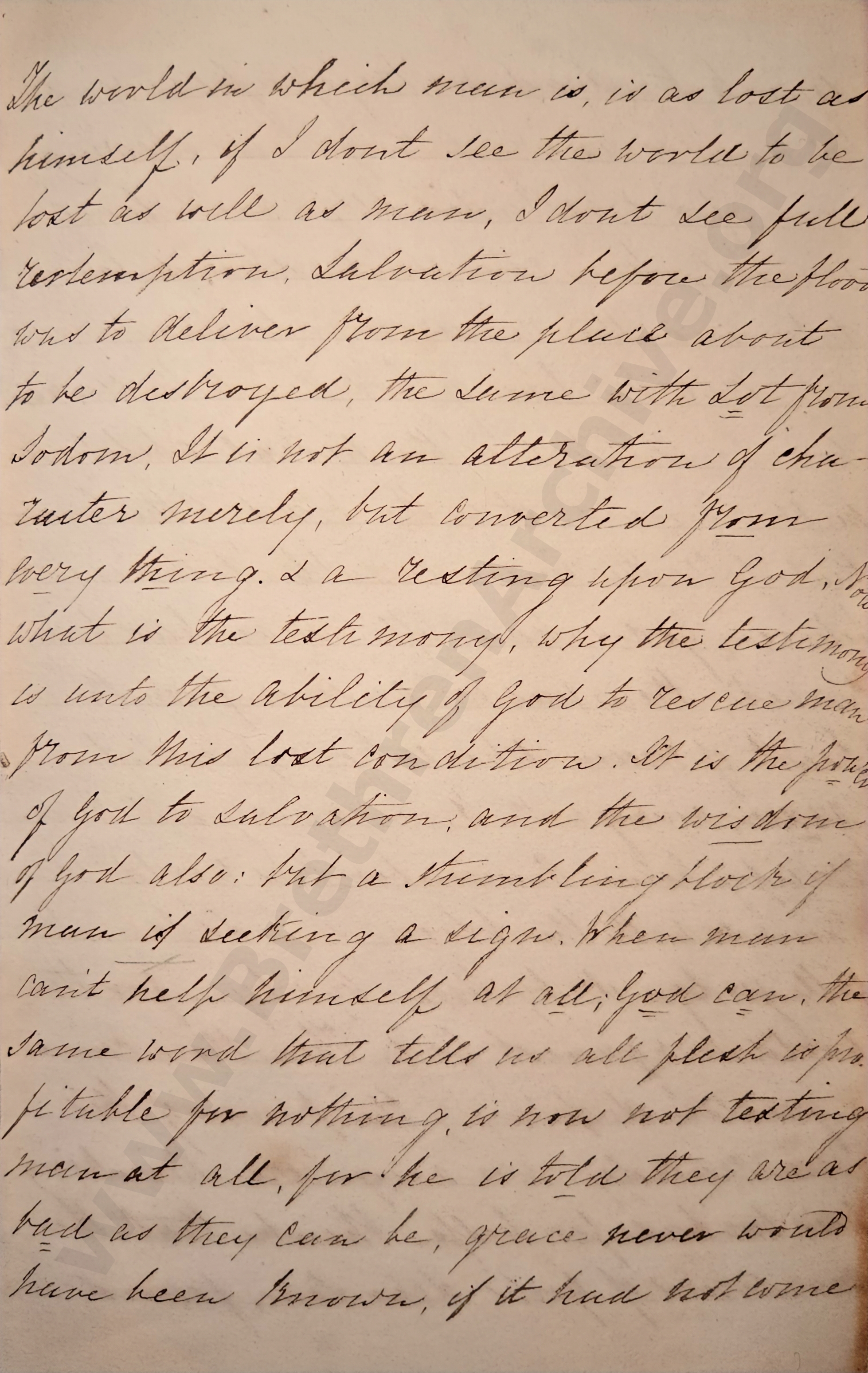 The world in which man is, is as lost as himself, if I don[’]t see the world to be lost as well as man, I don[’]t see full redemption. Salvation before the flood was to deliver from the place about to be destroyed, the same with Lot from Sodom. It is not an alteration of character merely, but converted from every thing, & a resting upon God. Now what is the testimony[?] Why the testimony is unto the ability of God to rescue man from this lost condition. Xt is the power of God to salvation and the wisdom of God also: but a stumbling block if man is seeking a sign. When man can’t help himself at all, God can, the same word that tells us that all flesh is profitable for nothing, is now not testing man at all, for he is told they are as bad as they can be, grace never would have been known, if it had not come