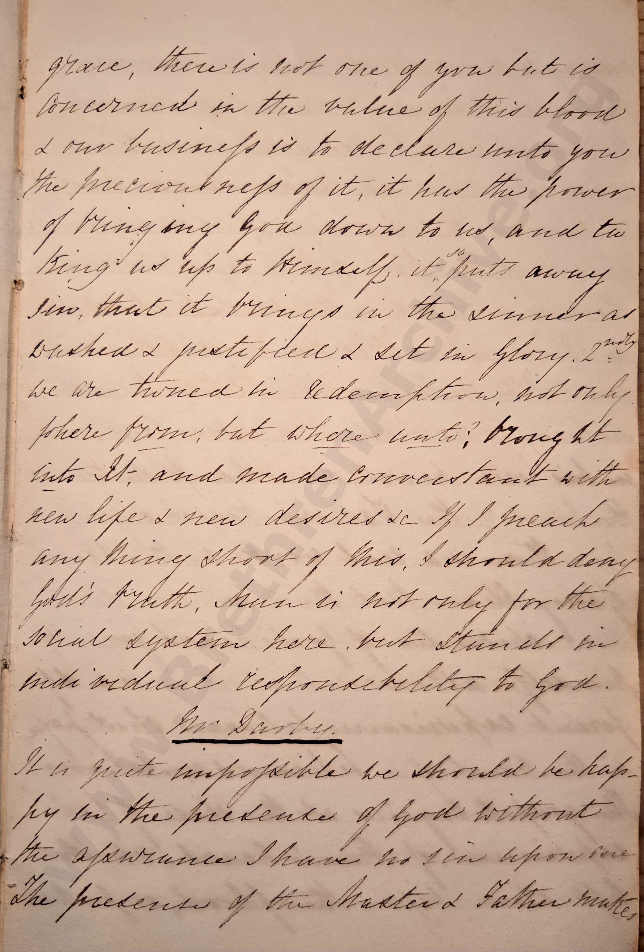 grace, there is not one of you but is concerned in the value of this blood & our business is to declare unto you the preciousness of it; it has the power of bringing God down to us and taking us up to Himself. It so puts away sin that it brings the sinner as washed & justified & set in glory. 2ndly we are ?turned in redemption not only where from, but where unto; brought into Xt and made ?converstant with new life & new desires &c. If I preach anything short of this, I should deny God’s truth. Man is not only for the social system here but stands in ?more ?ordered responsibility to God.