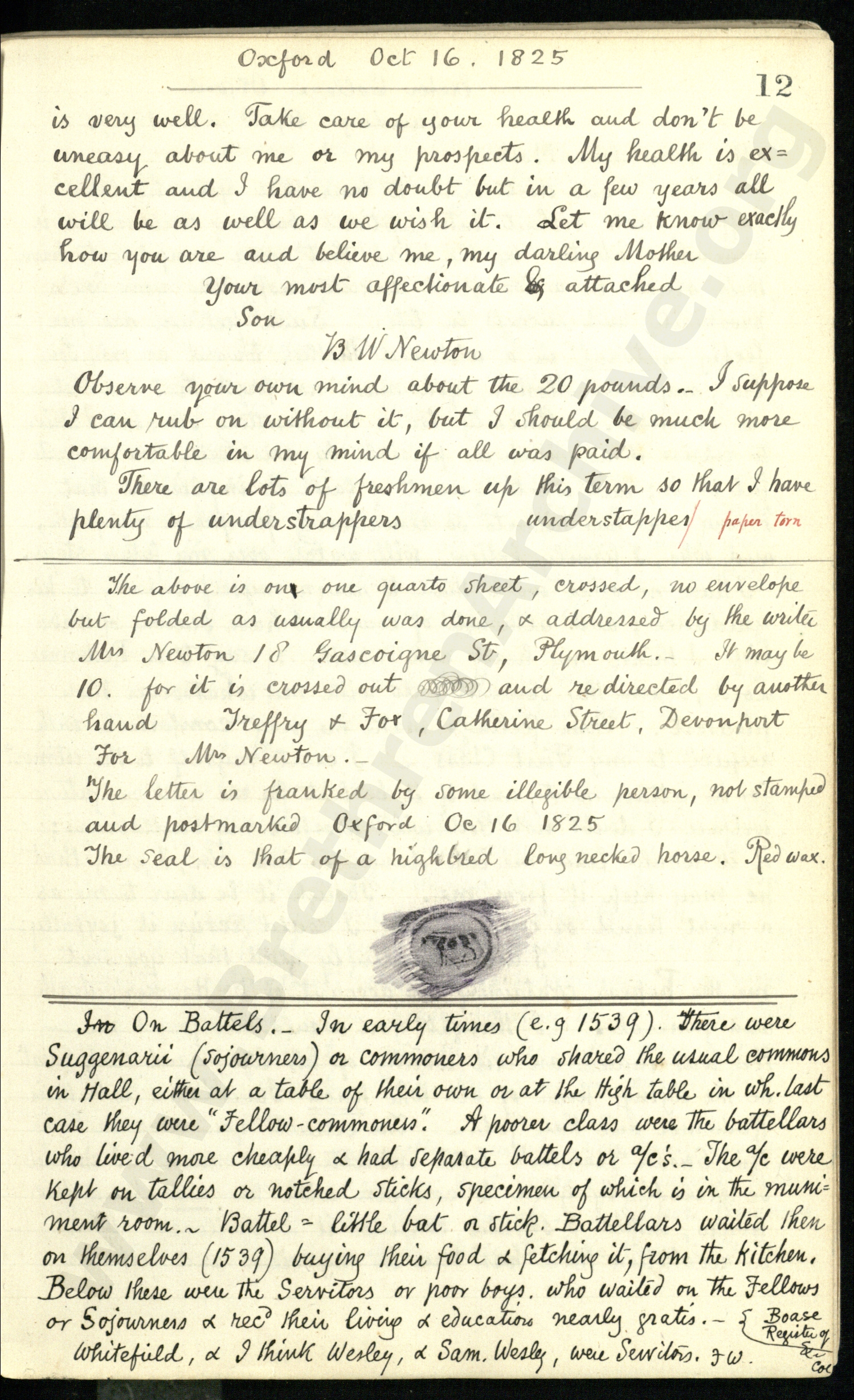 In On Battels. In early times ( e.g. 1539) there were Suggenarii (sojourners) or commoners who shared the usual commons in Hall, either at a table of their own or at the high table in wh. last case they were "Fellow-commoners". A poorer class were the battellars who lived more cheaply and had separate battels or a/c's. The a/c were kept on tallies or notched sticks, specimen of which is in the muniment room. Battel = little bat or stick. Battellars waited then on themselves (1539) buying their food and fetching it, from the kitchen. Below these were the Servitors or poor boys who waited on the Fellows or Sojourners and rec'd their living and education nearly gratis. Whitefield and I think Wesley and Sam, Wesley, were Servitors. F W (Boase Register of Ex Col)