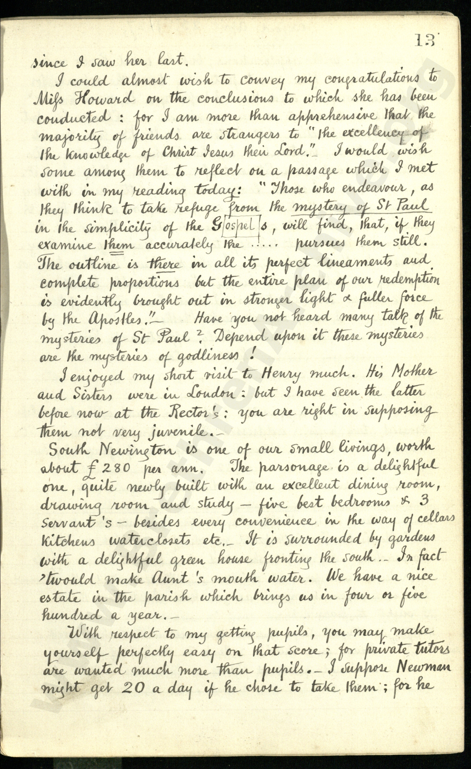 I could almost wish to convey my congratulations to Miss Howard on the conclusions to which she has been conducted: for I am more than apprehensive that the majority of friends are strangers to "the excellency of the knowledge of Christ Jesus their Lord". I would wish some among them to reflect on a passage which I met with in my reading today. "Those who endeavour as they think to take refuge from the mystery of St. Paul in the simplicity of the Gospels, will find, that, if they examine them accurarely the .[truth]... pursues them still. The outline is there in all its perfect lineaments and complete proportions but the entire plan of our redemption is evidently brought out in stronger light and fuller force by the Apostles." Have you not heard many talk of the mysteries of St. Paul? Depend upon it these mysteries are the mysteries of godliness!