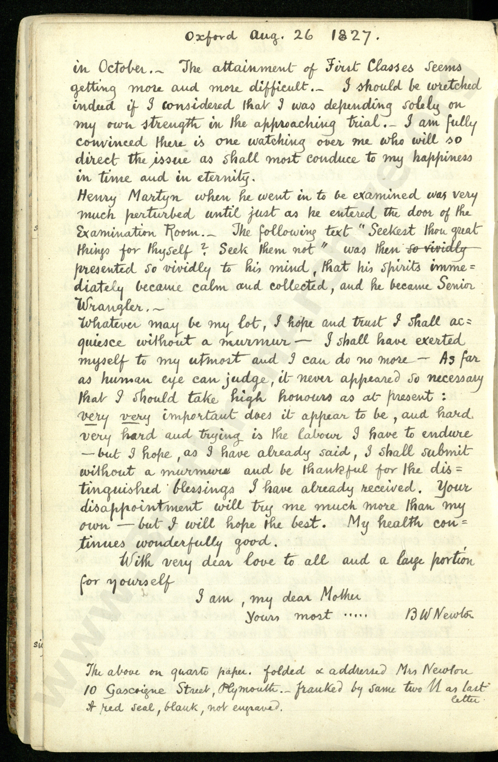 The above on quarto paper, folded, and addressed Mrs. Newton, 10 Gascoigne Street, Plymouth..franked by same two M as last letter A red seal, blank, not engraved.