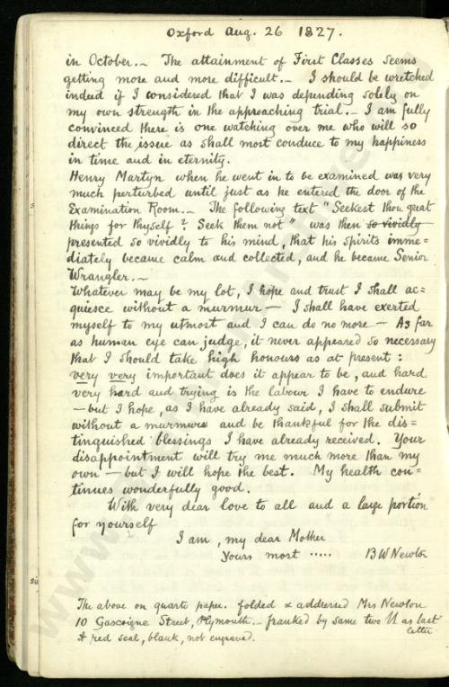 Whatever may be my lot, I hope and trust I shall acquiesce without a murmur - I shall have exerted myself to my utmost and I can do no more - as far as human eye can judge, it never appeared so necessary that I should take high honours as at present : very, very important does it appear to be, and hard very hard and trying is the labour. I have to endure - but I hope, as I have already said, I shall submit without a murmur and be thankful for the distinguished blessings I have already received. Your disappointment will try me much more than my own - but I will hope the best. My health continues wonderfully good.