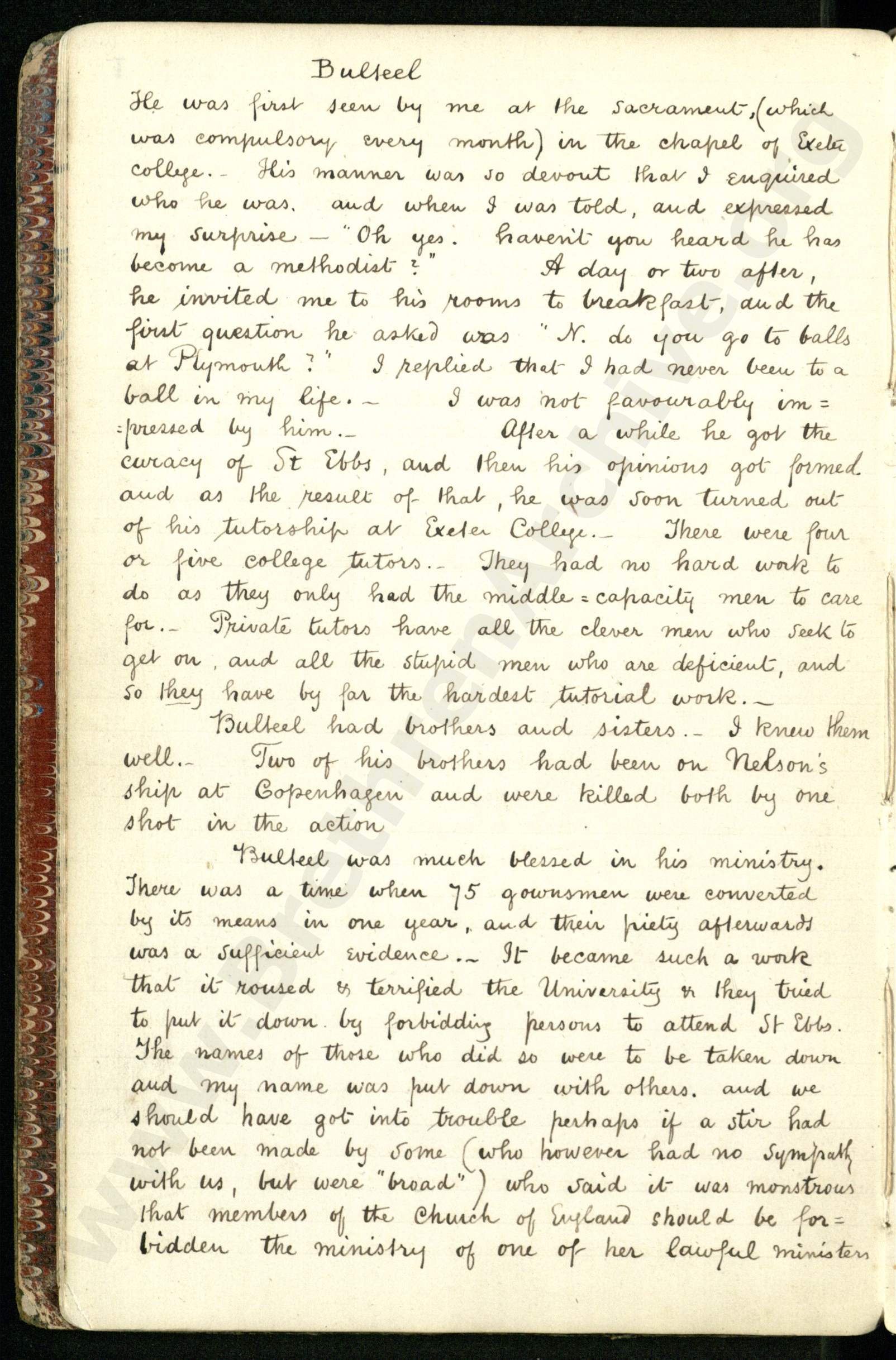 He was first seen by me at the sacrament (which was compulsory every month) in the chapel of Exeter College. His manner was so devout, that I enquired who he was, and when I was told, and expressed my surprise---Oh yes, haven't you heard, he has become a Methodist?" A day or two after, he invited me to his rooms to breakfast, and the first question he asked was, "N., do you go to balls at Plymouth?" I replied that I had never been to a ball in my life. I was not favourably impressed by him. After a while, he got the curacy at St. Ebbs, and then his opinions got formed, and as the result of that, he was soon turned out of his tutorship at Exeter College. There were four or five college tutors. They had no hard work to do as they only had the middle capacity men to care for. Private tutors have all the clever men who seek to get on, and all the stupid men who are deficient, and so they have by far the hardest tutorial work.