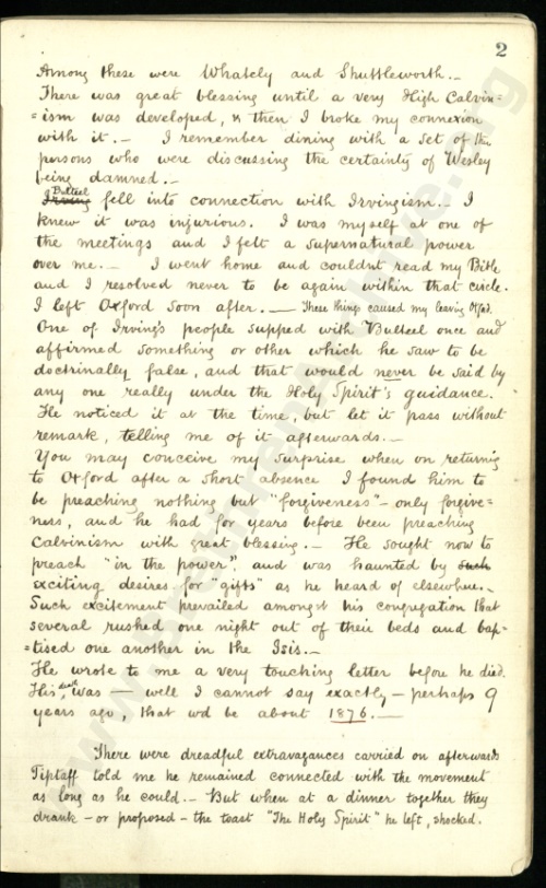 Among these were [Richard] Whately and [Philip] Shuttleworth. There was great blessing until a very High Calvinism was developed, and then I broke my connection with it. I remember dining with a set of the persons who were discussing the certainty of [John] Wesley being damned.