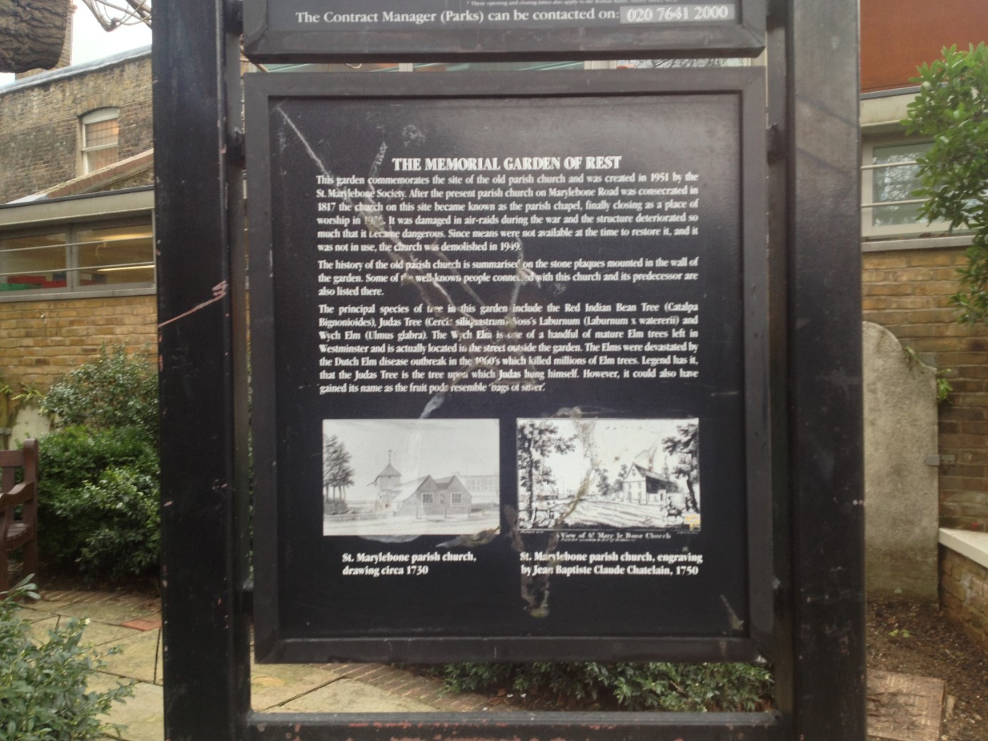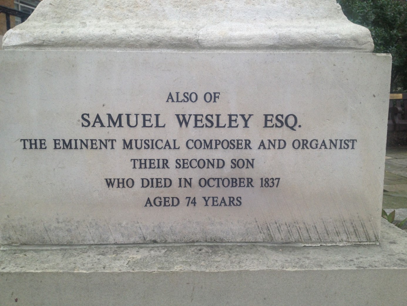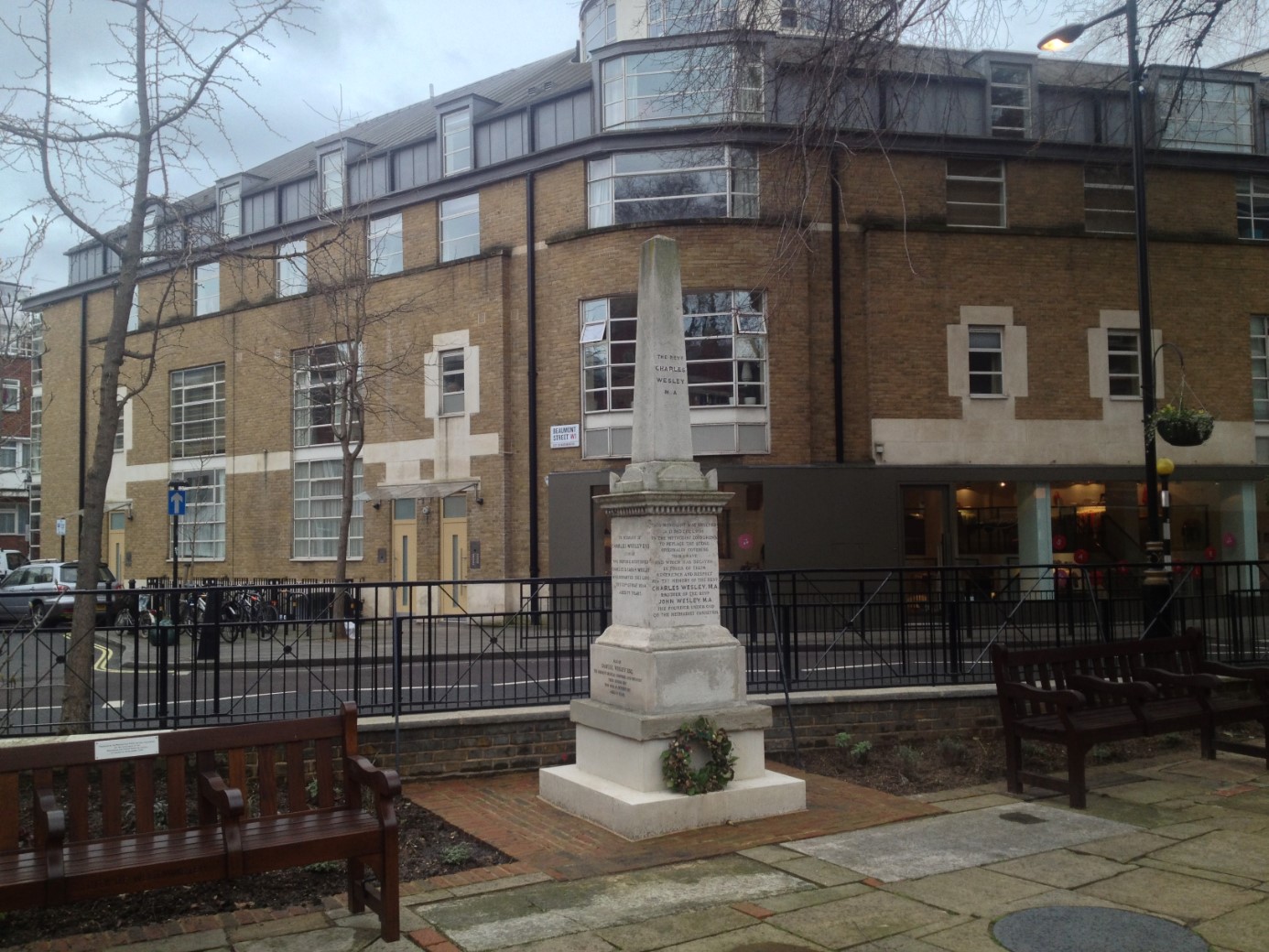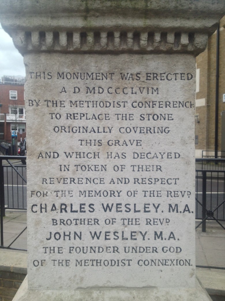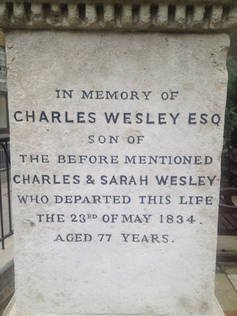 Situated in small memorial garden on the site of Old St Marylebone Church graveyard, indicating where Charles Wesley and members of his family are buried.