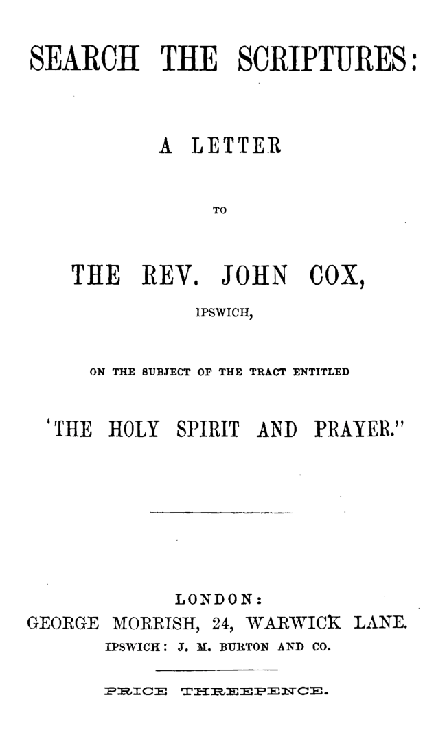 Search the Scriptures: A Letter to the Rev. John Cox, Ipswich, On the Subject of the Tract Entitled 'The Holy Spirit and Prayer'.