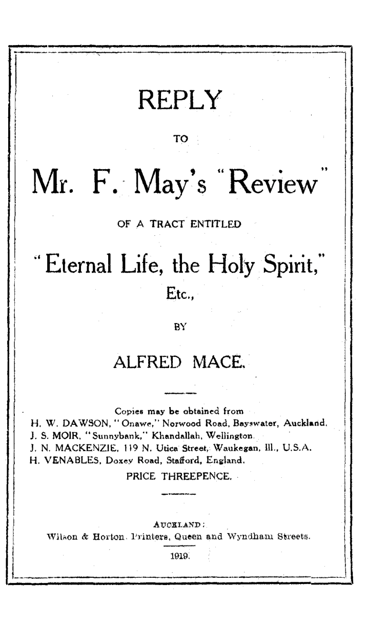 Reply to Mr F. May's "Review" of a Tract Entitled "Eternal Life, the Holy Spirit," Etc.