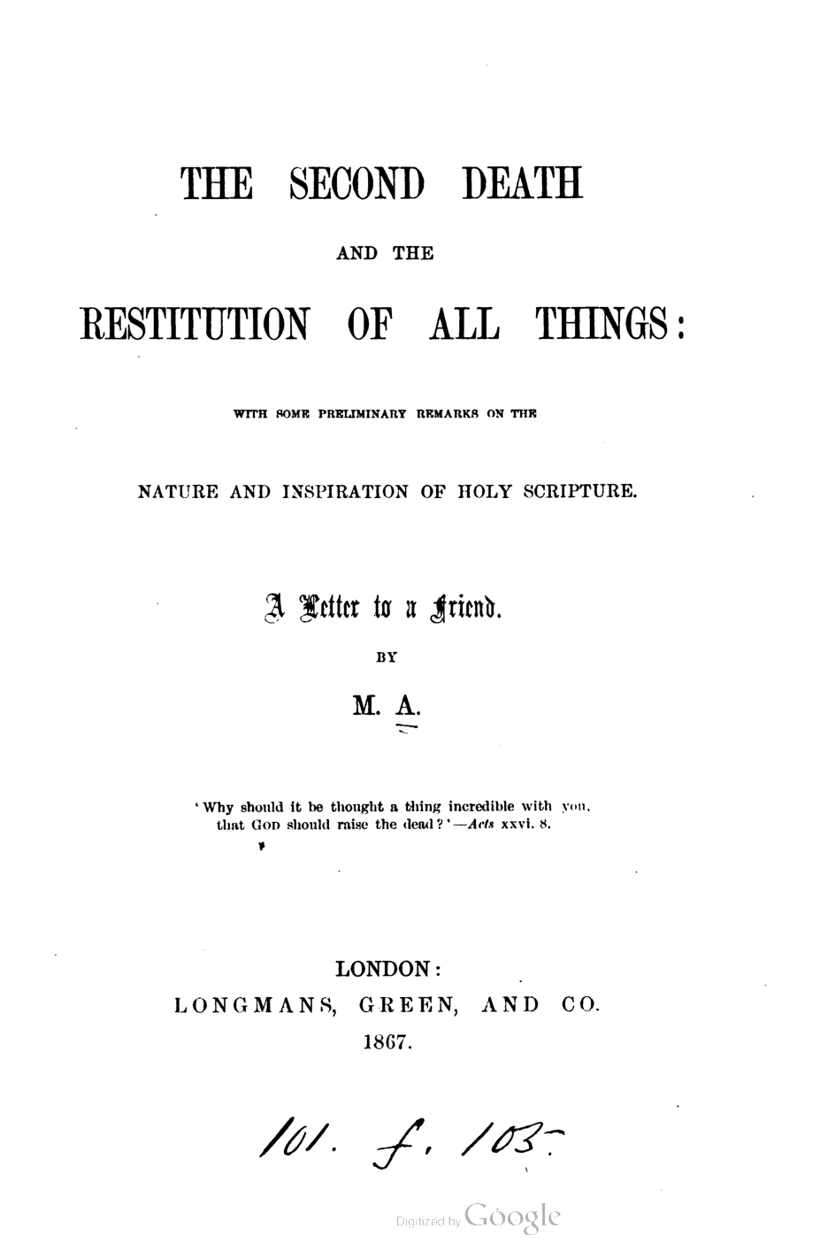 M.A.?? Uncertain, but the writer is Jukes, and the warning to be heeded. It is perhaps not surprising that in his postscript he appeals to William Law and quotes lengthy portions from Law's writings. Jukes writes on page 66: "And as by the hidden fire of this present life, shut up in these bodies of corruption, we are able by the wondrous chemistry of nature through corruption to change the fruits and flesh of the earth into our blood, and from blood again into our flesh and bone and sinew; so by the fire of God can we be changed, and made partakers of Christ's flesh and blood." This is not out of context. This is typical of how Law wrote. Darby wrote that Jukes in his book presents salvation by chastening, and denies divine life given and atonement for sin.