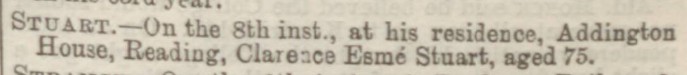 CLARENCE ESME STUART was the youngest son of Mr. Wm. Stuart, of Tempsford Hall, Sandy, and grandson of Hon. Wm. Stuart, Archbishop of Armagh, who, like that prelate's father, enjoyed the special confidence of King George III. The Earl of Bute was direct ancestor, likewise of the present Marquis of Bute. The family descends collaterally from the old royal house of Stuart, and C. E. Stuart was by some regarded as bearing a likeness to Charles I. His mother was a maid-of-honour to Queen Adelaide as Duchess of Clarence, who was his godmother; hence the name Clarence. The name Esme is one familiar to students of modern Scottish history.