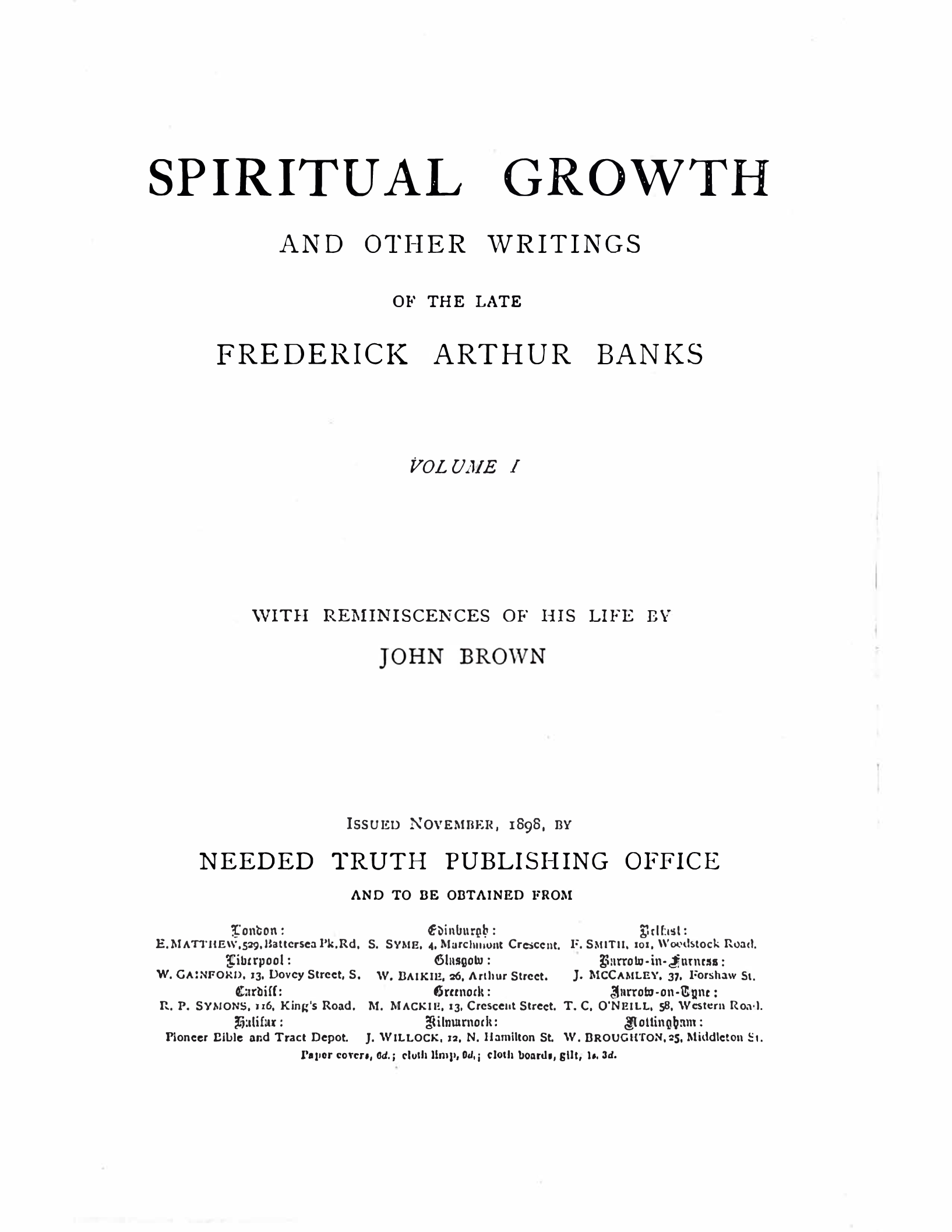 This document is of interest not least in that it contains Mr Banks' tract "The Church and the Churches of God". It sets out the basis of the "Needed truth" and the "Gospel Hall" concept that the phrase "church of God" applies only to a "scripturally gathered" local assembly, and not to the entire church, the body of Christ. It forms not only the church teaching of those that call themselves "The Churches of God in the fellowship of the Son of God, the Lord Jesus Christ" but also has generally spread out among those known as "Open Brethren" and is insisted on by their leading teachers.