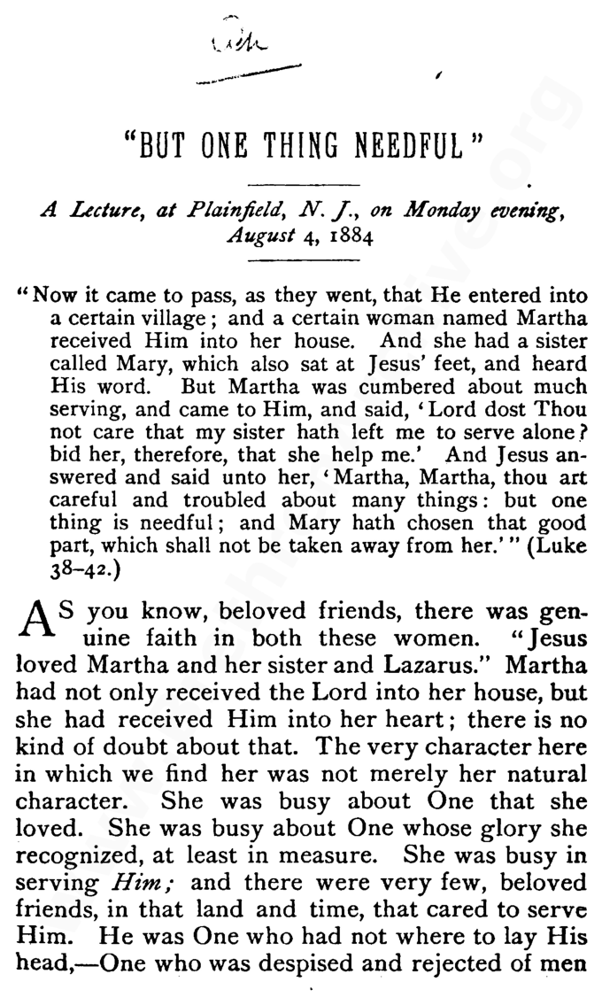 "But One Thing Needful"; A Lecture, at Plainfield, N.J.