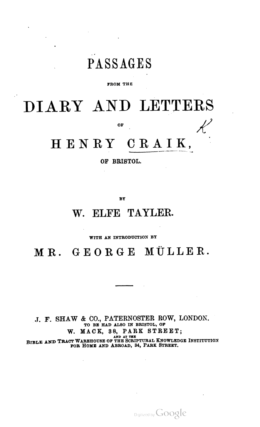 Passages from the Diary and Letters of Henry Craik of Bristol